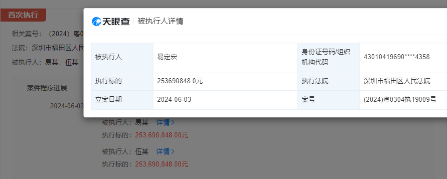 【大河财立方消息】6月18日消息,天眼查App显示,近日,易定宏、伍某某新增一条被执行人信息,执行标的2.53亿余元,涉及嘉兴稳弘三号投资合伙企业(有限合伙)与上述两人股权转让纠纷案件,执行法院为深圳市福田区人民法院。