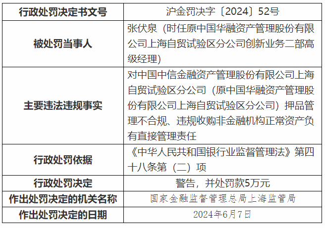 行政处罚信息显示,原中国华融资产上海自贸试验区分公司存在押品管理不合规、违规收购非金融机构正常资产等违法违规事实,时任该公司创新业务二部高级经理张伏泉负有责任,受到警告,并被罚款5万元。