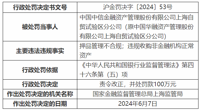 【大河财立方消息】6月18日,国家金融监督管理总局上海监管局披露的行政处罚信息显示,中国中信金融资产管理股份有限公司上海自贸试验区分公司(原中国华融资产管理股份有限公司上海自贸试验区分公司)被责令改正,并处罚款100万元。
