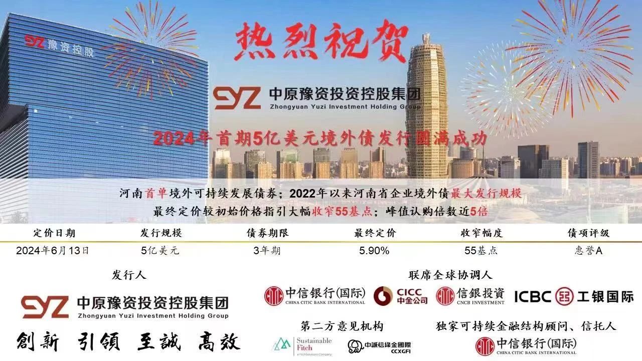【大河财立方 记者 裴熔熔】6月13日,中原豫资投资控股集团有限公司(以下简称豫资控股集团)2024年首期5亿美元境外债顺利完成发行。这是河南首单境外可持续发展债券,也是2022年以来河南省企业境外债最大发行规模,获得了境内外投资人广泛支持,认购倍数近5倍,市场化投资者占比50%以上,展现了河南国资良好形象。