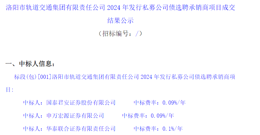 【大河财立方消息】6月20日,洛阳市轨道交通集团有限责任公司对2024年发行私募公司债选聘承销商项目成交结果进行公示。中标人分别为国泰君安、申万宏源、华泰联合证券,中标费率分别为0.09%/年、0.09%/年、0.1%/年。