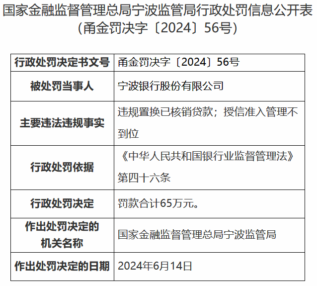 【大河财立方消息】6月21日,国家金融监督管理总局宁波监管局披露的行政处罚信息公开表显示,宁波银行因违规置换已核销贷款、授信准入管理不到位两项违法违规事实被罚款65万元。