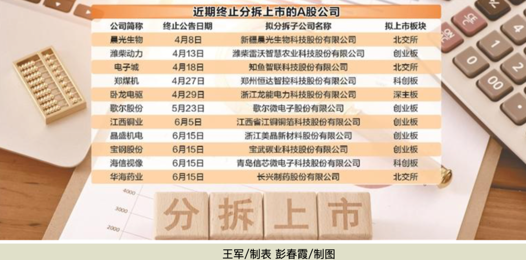 自2019年底分拆上市新规落地后,A股市场曾掀起分拆上市热潮,但随着市场环境变化,分拆上市的热度持续下降。近日,宝钢股份、晶盛机电、海信视像、华海药业等4家A股上市公司均披露公告,终止子公司分拆上市计划。