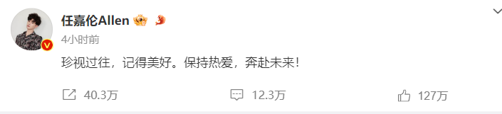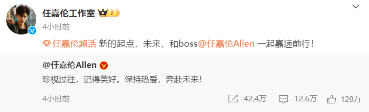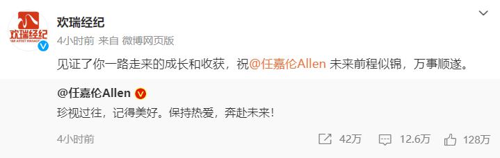 随后,任嘉伦工作室进行了转发:“新的起点,未来,和boss@任嘉伦Allen 一起嘉速前行!”原经纪公司欢瑞经纪也通过微博转发送祝福:“见证了你一路走来的成长和收获,祝任嘉伦未来前程似锦,万事顺遂。”