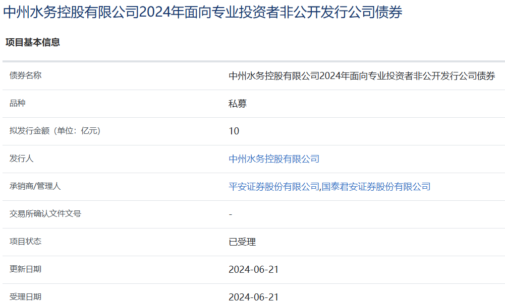 【大河财立方消息】6月23日消息,中州水务控股有限公司2024年面向专业投资者非公开发行公司债券项目获上交所受理。债券拟发行金额10亿元,承销商/管理人为平安证券、国泰君安证券。
