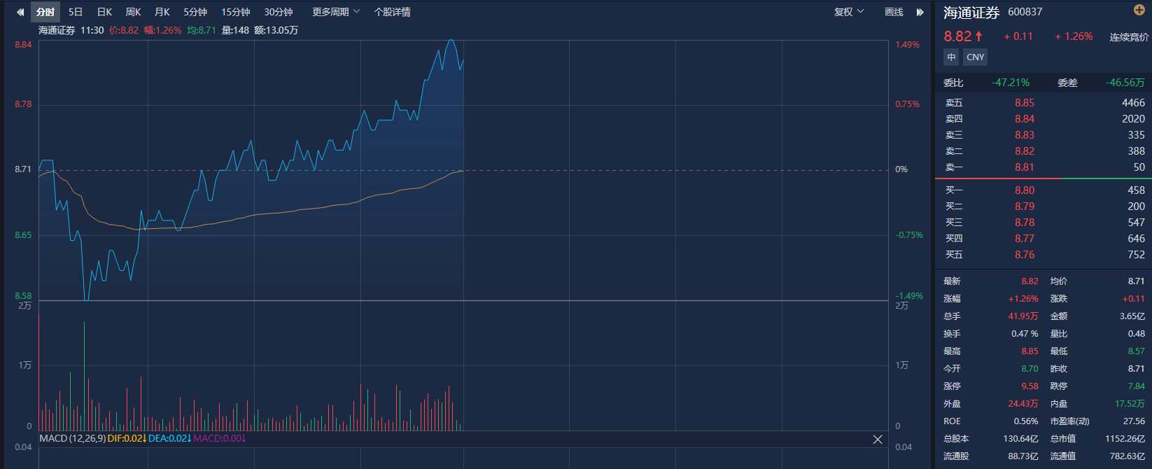 截至早盘收盘,海通证券涨1.26%,报8.82元/股,总市值1152亿元。