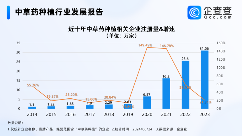 企查查数据显示,我国现存中草药种植相关企业94.92万家,近十年注册量持续增长。从2014年的1.1万家,增长至2019年的2.63万家,增速维持在10%~60%。2020年、2021年连续两年注册量涨幅超145%,分别达6.57万家、16.2万家。2022年、2023年分别注册25.6万家、31.06万家,同比增长58.02%、21.31%。截至目前,今年已注册12.93万家。