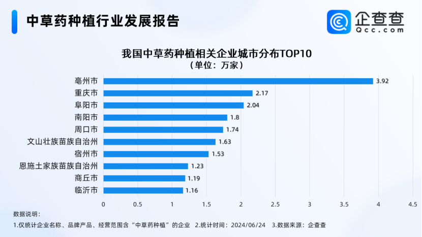 当然,安徽亳州一直是国内中药材全产业链最领先的城市。该区域的药材交易额、中药饮片生产、养生花茶加工等均居全国首位。企查查数据显示,亳州中草药相关种植企业数量以3.92万家,居全国第一。