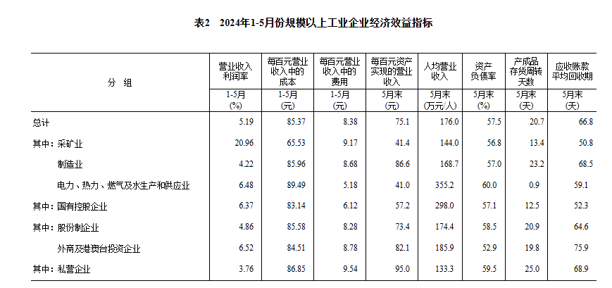 1—5月份,规模以上工业企业实现营业收入53.03万亿元,同比增长2.9%;发生营业成本45.27万亿元,增长3.0%;营业收入利润率为5.19%,同比提高0.02个百分点。
