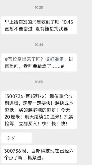 临近今日午间,有投资者在社交网络上晒出多份聊天记录,其中记载了多个股票群“老师”荐股百邦科技,喊话让群友买入。值得注意的是,这些推票时点多集中在10时55分左右,正好位于百邦科技闪崩的前三分钟。从百邦科技相关股票交流论坛上看,部分股民因此中招,在股票拉高阶段误入或直接买在最高点而遭受损失,也有股民因为买慢了没有入场而直呼庆幸。