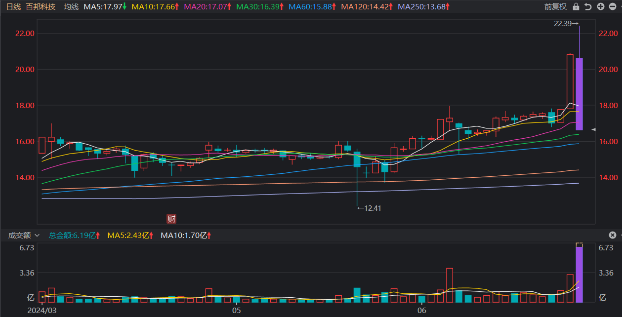 今日(6月27日),百邦科技股价大幅异动,其于10时58时起直线跳水,仅6分钟后便20cm封板跌停,虽然随后有所震荡修复,但仍走低跌停。受“高台跳水”行情影响,其也向下反包,尽数吐出昨日近17%的全部涨幅。