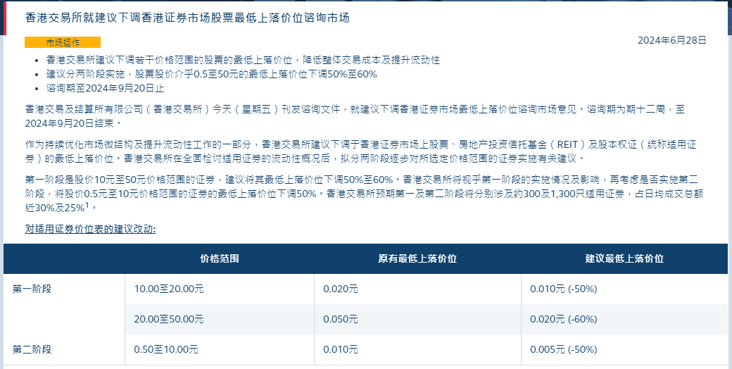 香港交易所建议下调若干价格范围的股票的最低上落价位,降低整体交易成本及提升流动性;建议分两阶段实施,股票股价介乎0.5至50元的最低上落价位下调50%至60%;咨询期至2024年9月20日止。
