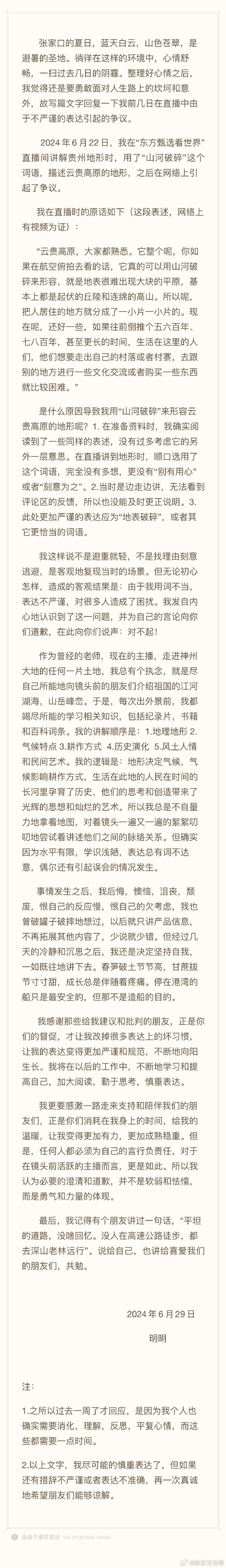 【大河财立方消息】6月29日,东方甄选主播明明(石明)在微博回应日前直播中用“山河破碎”描述贵州地形引发的争议。