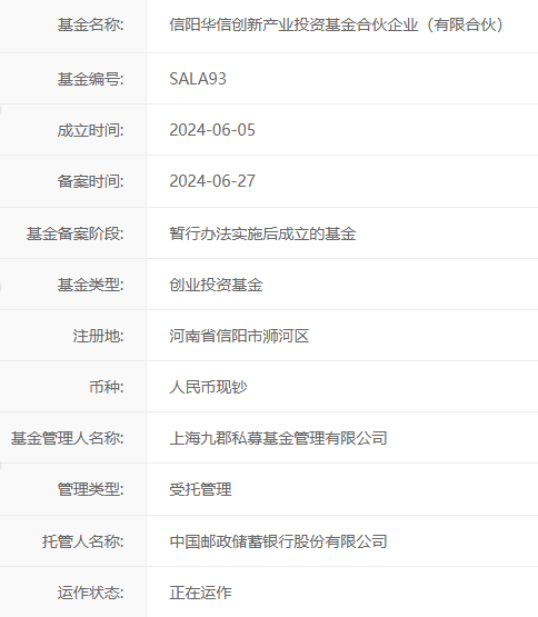 【大河财立方消息】6月30日消息,信阳华信创新产业投资基金合伙企业(有限合伙)日前在中基协备案。
