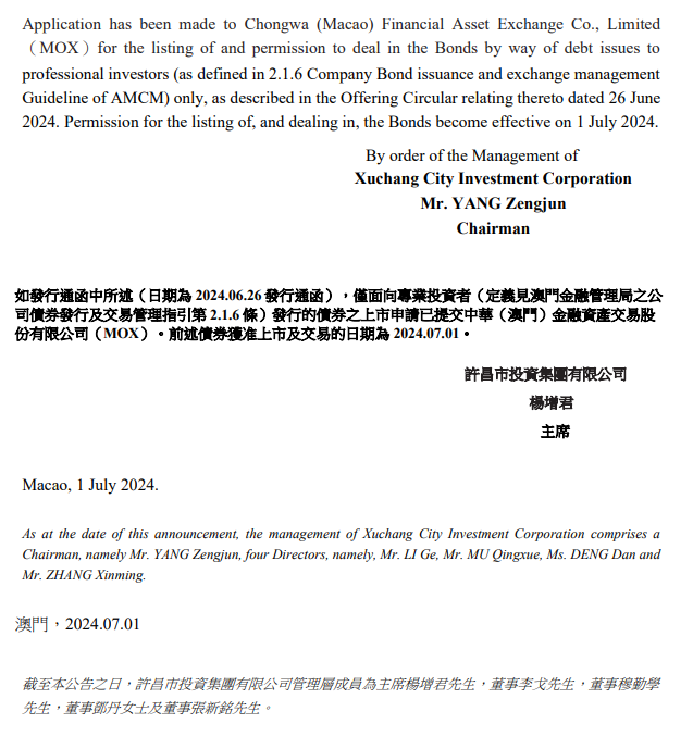 【大河财立方消息】7月1日,许昌市投资集团有限公司公告,2026年到期的5000万美元票息9.5%债券(ISIN:XS2845584726)上市申请已提交中华(澳门)金融资产交易股份有限公司(MOX)。前述债券获准上市及交易的日期为2024年7月1日。