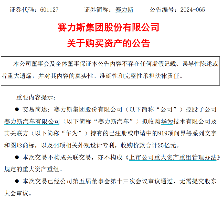 赛力斯:子公司拟25亿元收购华为持有的问界商标及相关专利