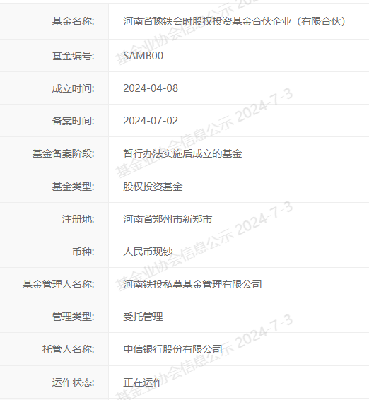 【大河财立方消息】7月3日消息,河南省豫铁会时股权投资基金合伙企业(有限合伙)于7月2日在中基协备案。