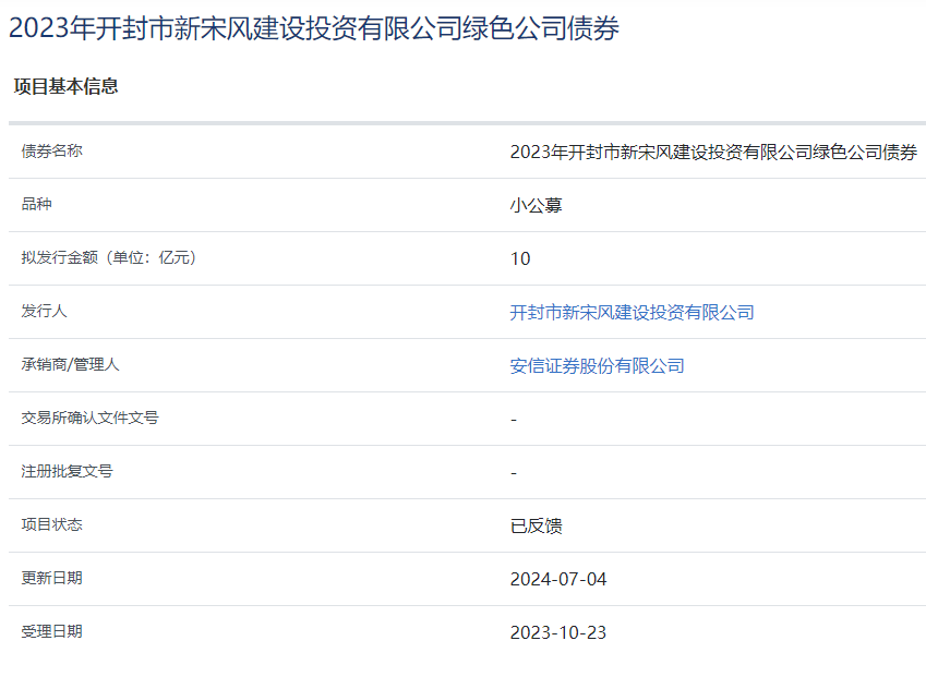 【大河财立方消息】7月4日,据上交所消息,2023年开封市新宋风建设投资有限公司绿色公司债券项目状态更新为“已反馈”。该债券拟发行金额10亿元,承销商/管理人为安信证券。经联合资信评估股份有限公司综合评定,发行人长期主体信用评级为AA,本次债券信用级别为AAA。