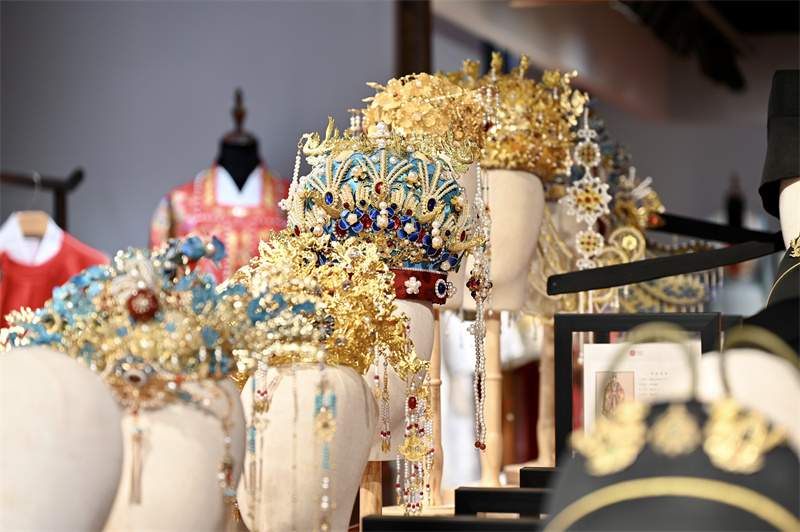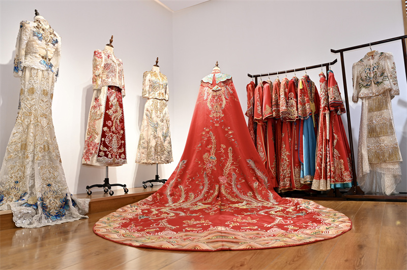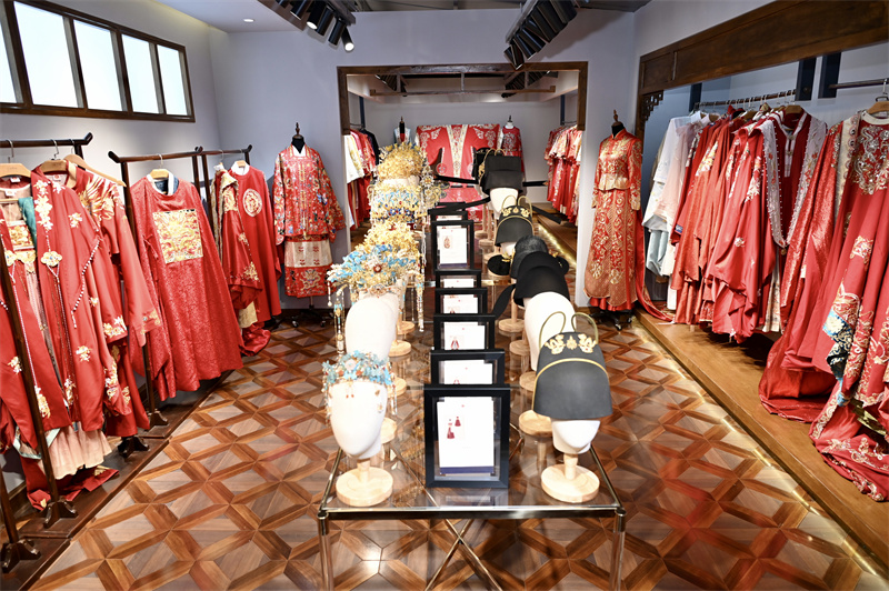 在小科所在的大象映画洛阳店,记者看到了各式各样的汉服婚服,唐制、宋制、明制……不同时期的汉服各有不同,或精美华丽,或低调端庄,风格各异。