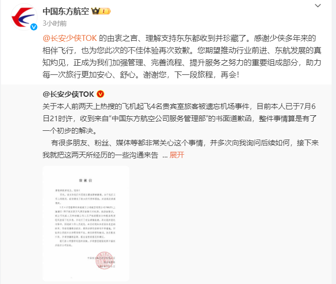 【大河财立方消息】日前,“航班备降重新起飞遗漏4名贵宾休息室旅客”事件引发热议,7月7日,事件当事人在社交平台公开了中国东航致歉信。