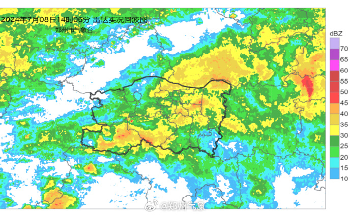 7月8日14时06分,登封市、管城回族区、中原区、金水区、高新区、二七区、郑东新区、惠济区、经开区、中牟县、巩义市、航空港区、新密市、荥阳市、新郑市有降水回波,最大回波强度50-55dBZ。