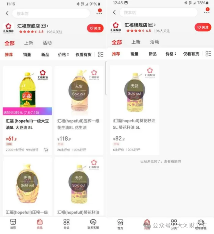 截至目前,除了金鼎食品油和汇福食用油的直营网店外,在淘宝、天猫、京东、拼多多、抖音等电商平台中,还有少部分商家正常销售金鼎食用油和汇福食用油。