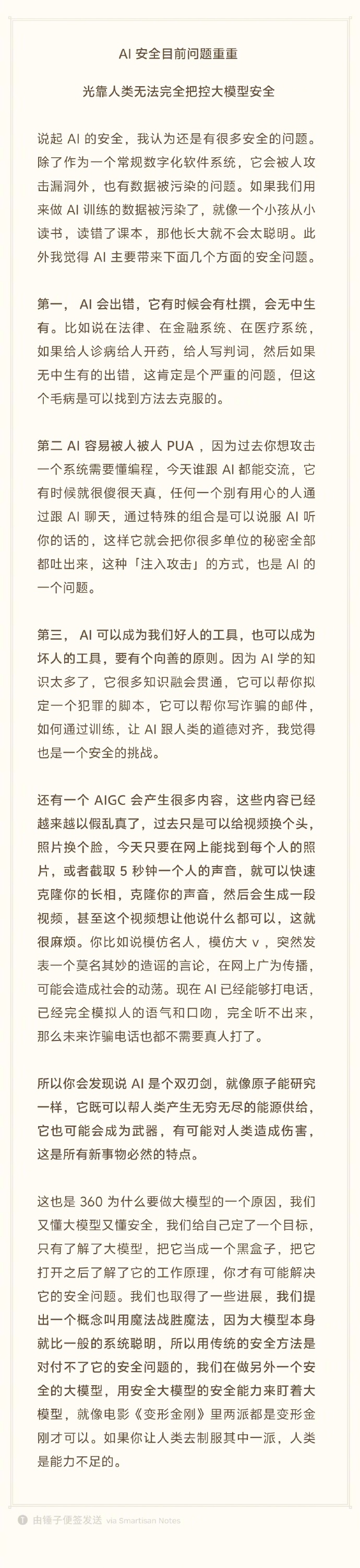 周鸿祎称,说起AI的安全问题,我认为有以下几个:第一AI会出错,它有时候会杜撰、无中生有;第二AI容易被人PUA,有时候它很傻很天真;第三AI可以成为好人的工具,也可以成为坏人的工具,要有个向善的原则。第四,AIGC产生的很多内容,越来越以假乱真。所以AI是个双刃剑,这也是360为什么做大模型的原因,我们既懂大模型又懂安全,可以用魔法打败魔法,我们在做一个安全大模型,用这个大模型的安全能力来盯着大模型。