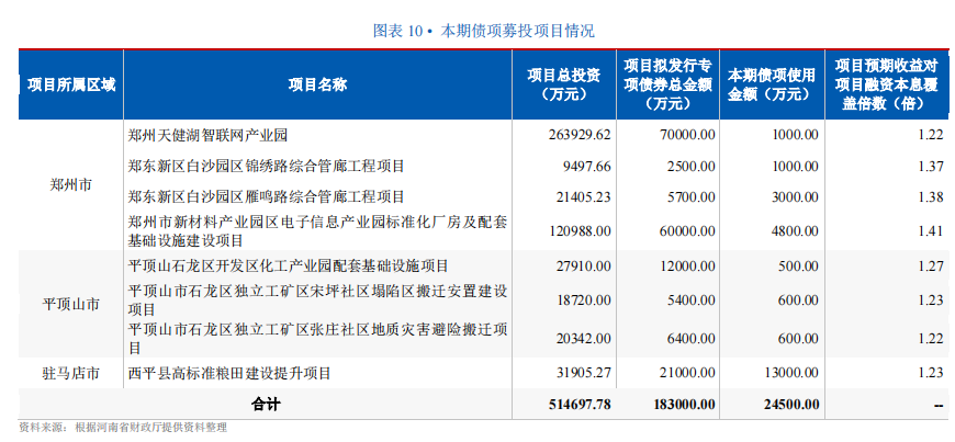 其中,2024年河南省城乡发展专项债券(五期)-2024 年河南省政府专项债券(十八期)发行总额 2.45 亿元,期限10年。涉及8个募投项目。