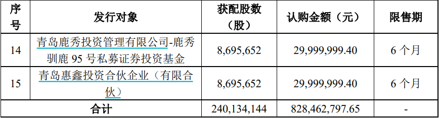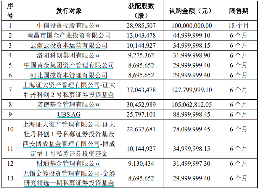15家机构投资者参与认购,包括中信投资控股有限公司、南昌市国金产业投资有限公司、洛阳科创集团有限公司、中国黄金集团资产管理有限公司、河北国控资本管理有限公司、UBS AG等。