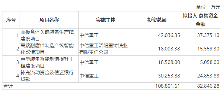 募集资金拟用于面板盒体关键装备生产线建设项目、高端耐磨件制造产线智能化改造项目、重型装备智能制造提升工程建设项目、补充流动资金及偿还银行贷款。