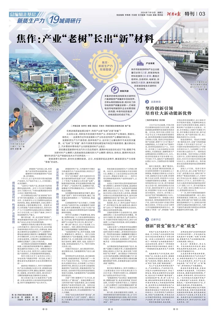 新能源牵引新材料,新材料支撑新能源。近日,河南日报调研组走进焦作,解读新质生产力培育“答卷”的成色。
