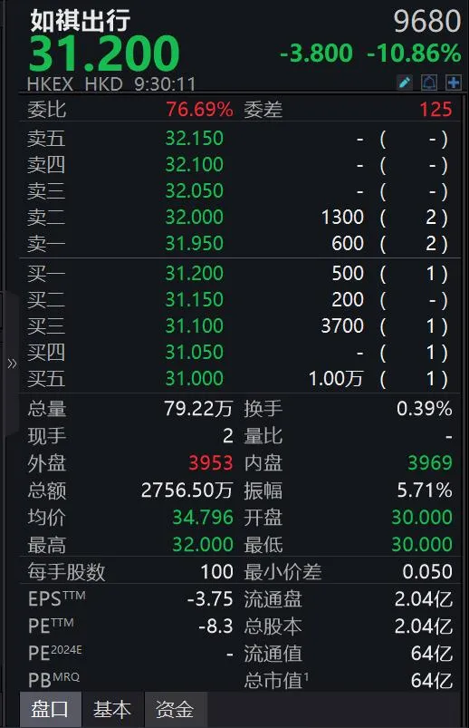 截至9点30分记者发稿时,如祺出行股价由盘前微涨转至下跌,总市值约64亿港元。