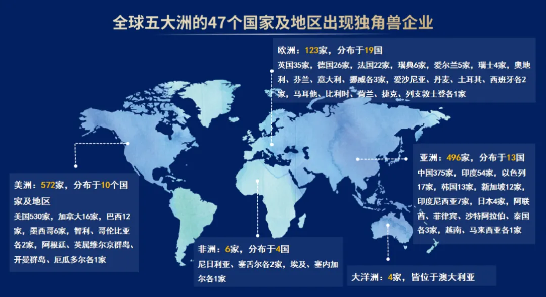 从地域分布看,2023年全球独角兽企业分布于五大洲的47个国家及地区。