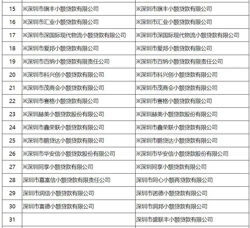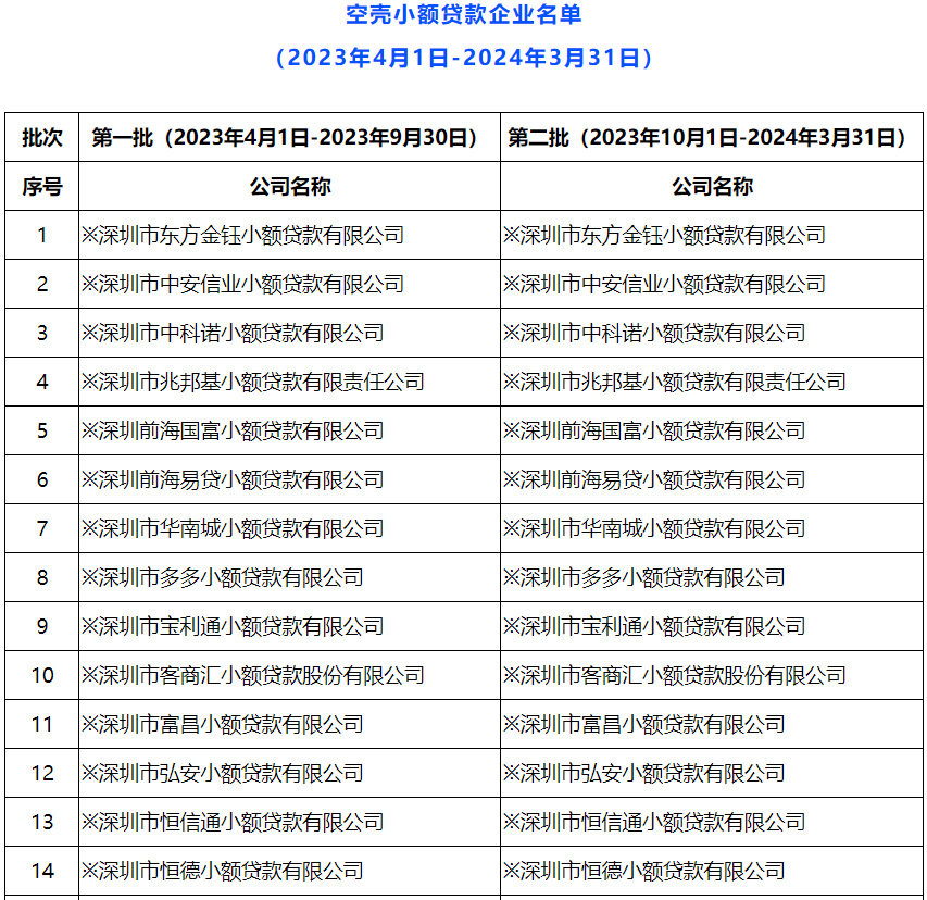 深圳市地方金融管理局对两批(第一批:2023年4月1日-2023年9月30日;第二批:2023年10月1日-2024年3月30日)符合“空壳”小额贷款公司认定的公司名单进行公示,共涉及35家企业。深圳市地方金融管理局提醒企业与个人谨慎与上述公司开展合作。