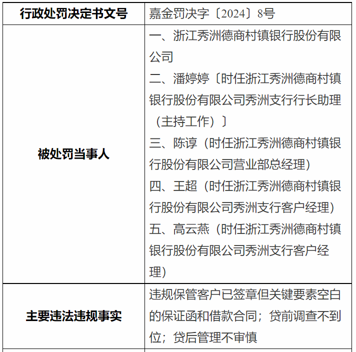 时任浙江秀洲德商村镇银行营业部总经理陈谆,秀洲支行客户经理王超、高云燕分别受到警告处分。