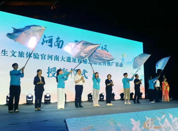 仪式的最后,大学生文旅体验官代表进行了发言。与会领导共同为大学生文旅体验官河南大遗址探秘之旅授旗,采风活动正式开启。