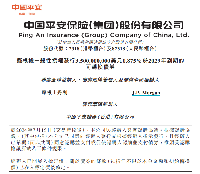 【大河财立方消息】7月16日早间,中国平安在港交所公告,拟发行35亿美元可转换债券,年利率为0.875%,该期债券将于2029年到期,初始转换价为每股H股43.71港元(可予调整)。中国平安已于7月15日(交易时段后)与经办人签署认购协议。