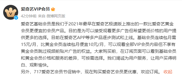 对此,7月16日,@爱奇艺VIP会员微博发文回应基础会员权益争议问题。