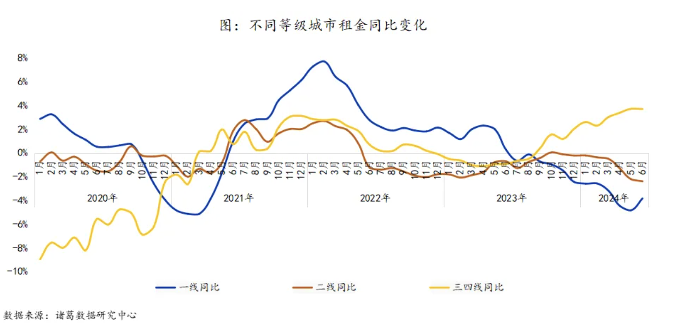 从供给端来看,重点一、二线城市在租房源水平仍然高于去年同期,房源竞争仍存,这或许也是租金同比走势持续较弱的原因之一。诸葛找房数据研究中心统计的数据显示,2024年6月一线城市在租量同比上涨10.25%,二线城市同比上涨11.25%。截至今年6月,一、二线城市在租房源量同比已分别连续18个月、11个月呈现正增长。