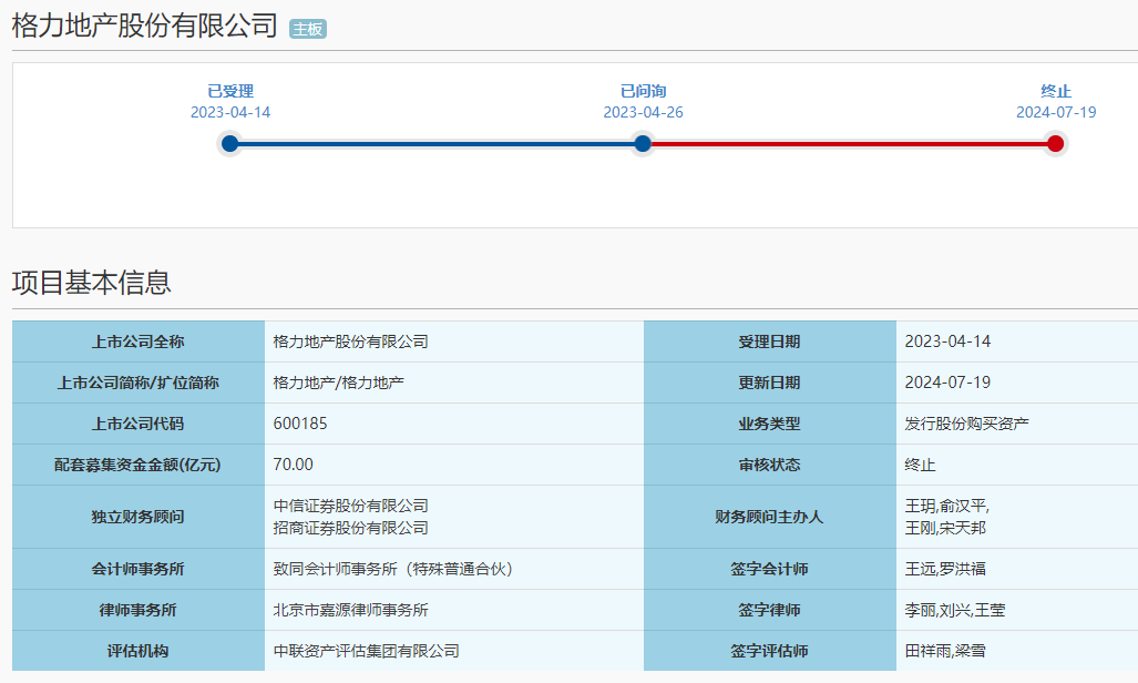 【大河财立方消息】7月19日,上交所终止审核格力地产并购重组事项。
