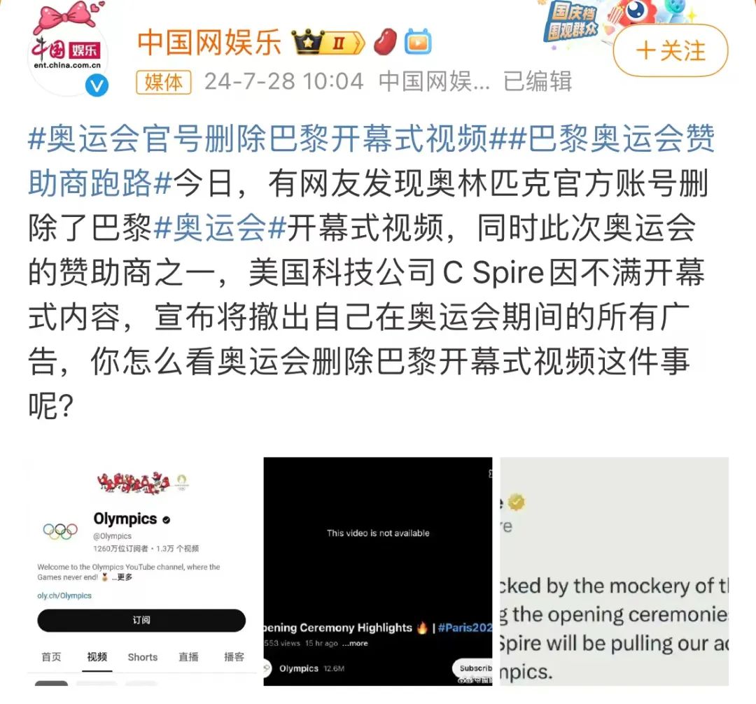 今日,有网友发现奥林匹克官方账号删除了巴黎奥运会开幕式视频,同时此次奥运会的赞助商之一,美国科技公司C Spire因不满开幕式内容,宣布将撤出自己在奥运会期间的所有广告。