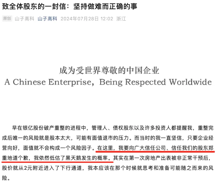 证券时报·e公司记者注意到,7月28日午间,山子高科微信号发布了由公司实际控制人、董事长、总经理叶骥署名的《致全体股东的一封信:坚持做难而正确的事》文章。