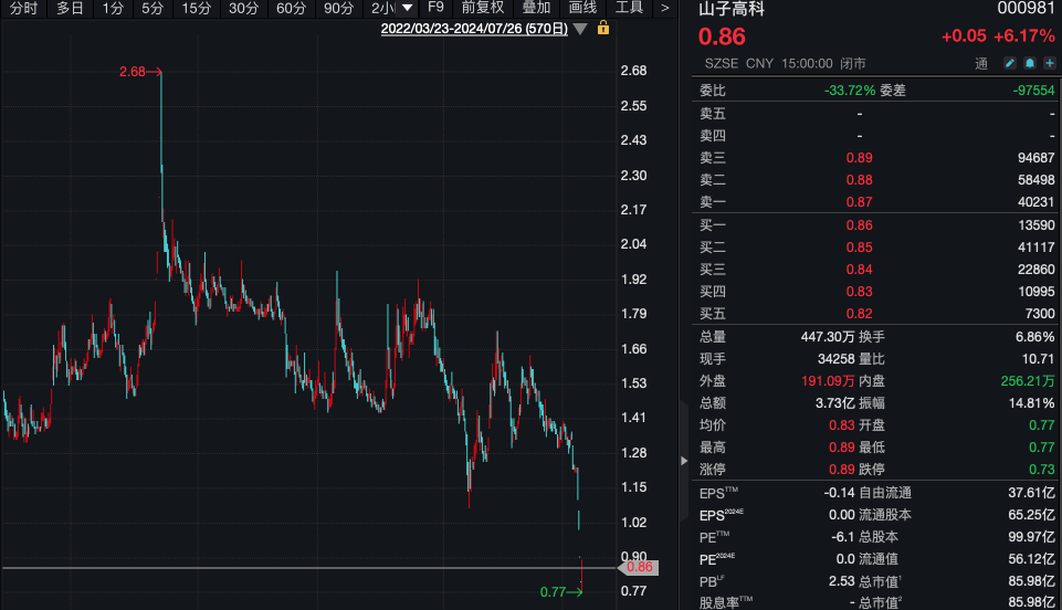 不过,这样一家百亿级资产的企业,如今却是退市风险悬顶。截至7月26日收盘,山子高科股价报收于0.86元/股,已连续三个交易日低于1元/股。