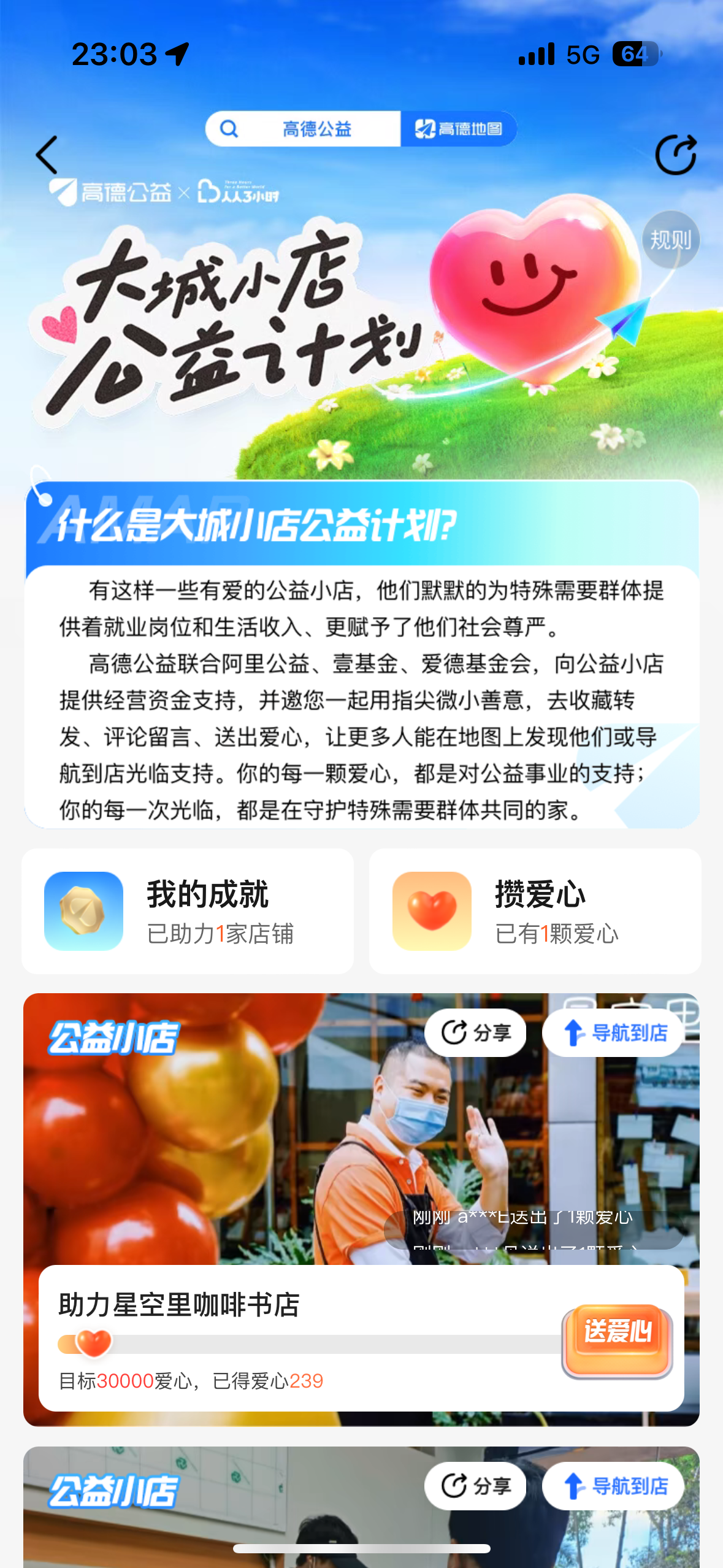 据悉,高德地图也为广大爱心网友开设了公益行为互动页面,搜索“高德公益”即可进入页面,送出爱心、收藏转发、评论留言,导航到店,用指尖微小善意为店铺累积“爱心值”,帮助店铺解锁更多公益支持。