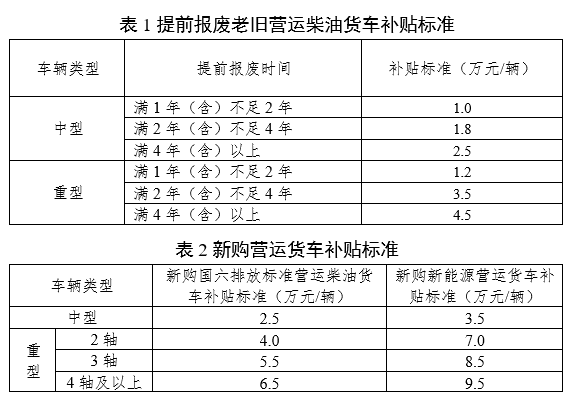 通知提到,对提前报废国三及以下排放标准营运柴油货车、提前报废并新购国六排放标准货车或新能源货车、仅新购符合条件的新能源货车,分档予以补贴。已获得中央其他资金渠道支持的车辆,不纳入本次补贴资金支持范围。上述补贴政策实施期限为本文件印发之日至2024年12月31日。