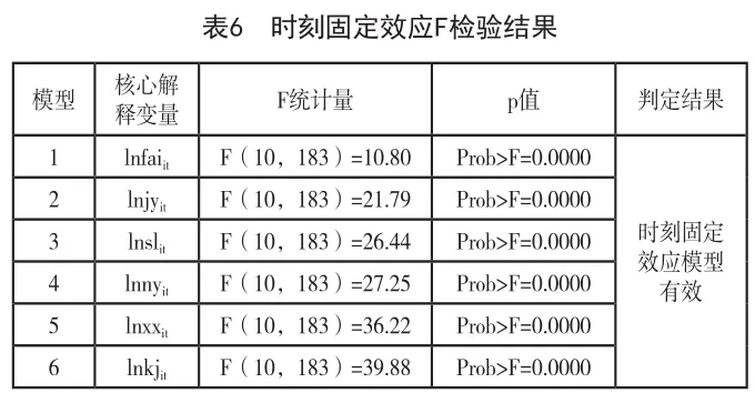 针对时刻固定效应,原假设为不存在时刻固定效应。由表6可知,所有核心解释变量所构建面板模型的回归结果中F检验P值均为0.0000,在1%的水平下强烈拒绝原假设,表明时刻固定效应模型有效。