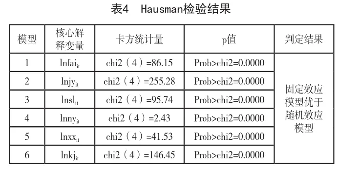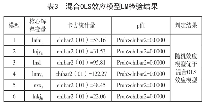 LM检验原假设为使用OLS混合模型。由表3可知,对于随机效应模型而言,所有核心解释变量所构建面板模型的LM检验回归结果中P值均为0.0000,强烈拒绝原假设,表明随机效应模型优于混合OLS模型。