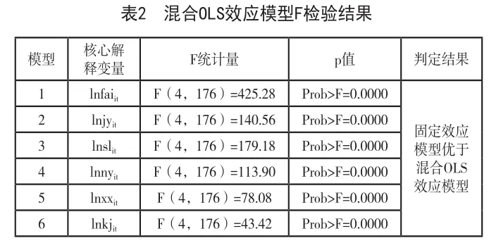 F检验原假设为使用混合OLS模型。由表2可知,对于固定效应模型而言,所有核心解释变量所构建面板模型的回归结果中F统计量P值均为0.0000,强烈拒绝原假设,表明固定效应模型优于混合OLS模型。