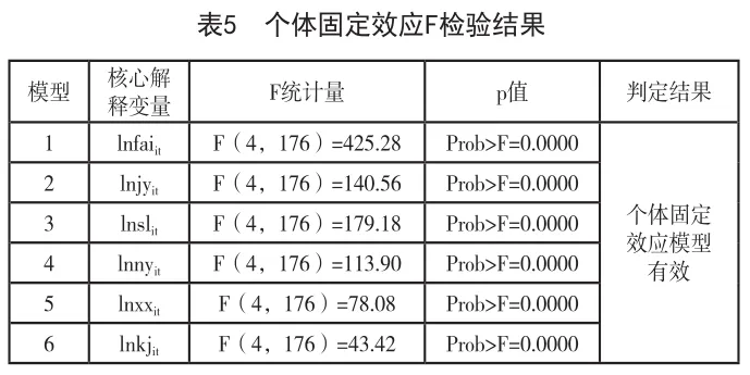 针对个体固定效应,F检验原假设为不存在个体固定效应。由表5可知,所有核心解释变量所构建面板模型的回归结果中F检验P值均为0.0000,在1%的水平下强烈拒绝原假设,表明个体固定效应模型有效。