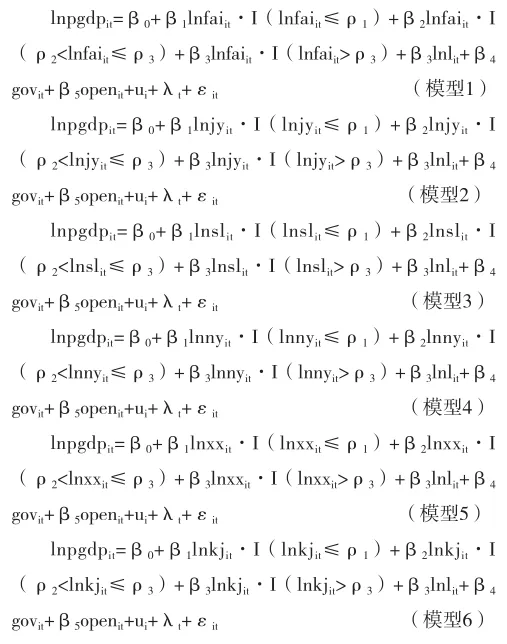 其中,下标t代表时间,i代表不同地市,pgdpit表示i省在第t期的经济增长水平(其他同理),εit为随机扰动项,包括不可观测变量和不主要研究变量的干扰,β0代表模型的常数项,β1表示各核心解释变量所代表的领域基础设施投资存量和经济增长水平的相关系数,系数的大小代表各核心解释变量所代表的领域基础设施投资对经济增长的影响程度。I()表示为指示函数,I根据括号中的条件是否满足来决定其数值等于1或0,当条件满足时,I取值为1,条件不满足则取值为0,各核心解释变量也是门槛变量,ρ为门槛值。